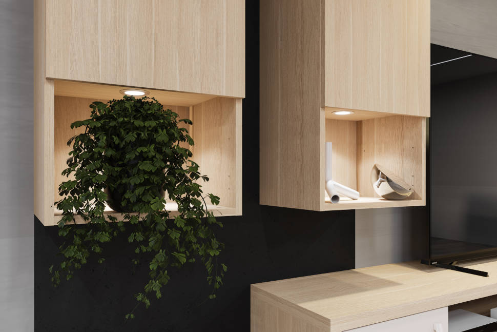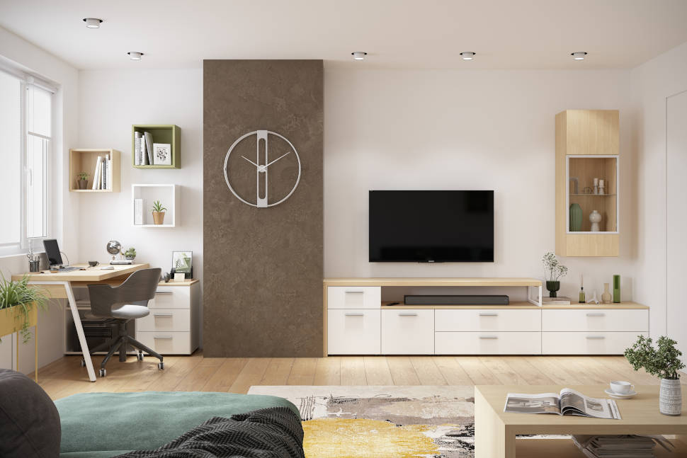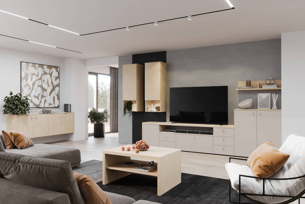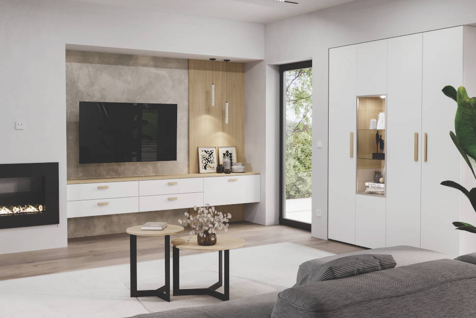 Dnevna soba Magnet je izdelana v enakem dekorju in enaki obliki kot predsoba in spalnica Magnet, tako lahko dosežete celovit in enoten videz vašega bivalnega prostora.