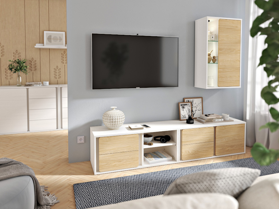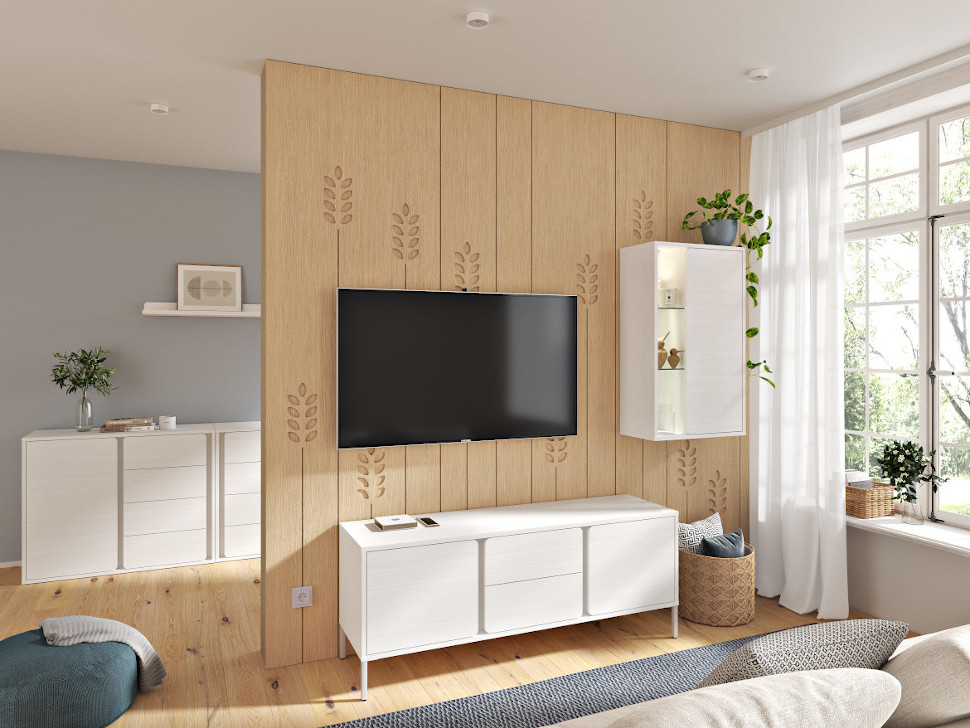 Odkrijte čar elegantne dnevne sobe Medeja v svežem in sodobnem dizajnu, ki združuje bele odtenke z nežnim lesnim dekorjem.