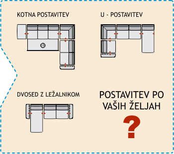 Vsak model sedežne garniture ima določen nabor elementov, katere lahko poljubno sestavimo v željen sestav.