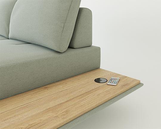 Vsak sedežni element ima lahko na koncu (ali v sredini) vgrajeno odlagalno polico poljubne širine, ki je obdelana s hrastovim furnirjem (ali barvo po želji).