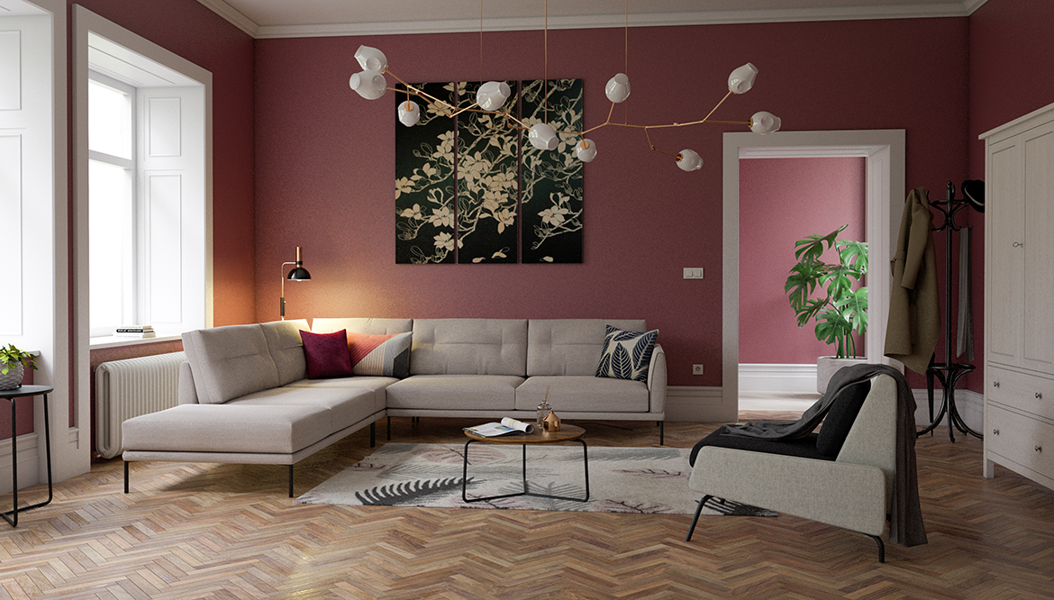 Zaradi ožjega hrbtišča in ozkih rokonaslonov je Toscana dobra izbira za manjše bivalne prostore, kjer je pomemben maksimalen izkoristek prostora. Na sliki simpatčna Toscana v pastelno roza barvi v manjši postavitvi z ležalnikom